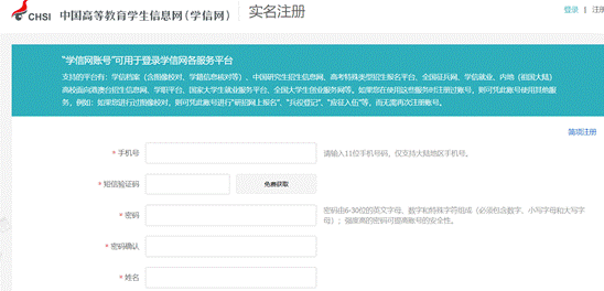 1、未注册过学信网账号的,点击上图的“注册”后,跳转到如下页面,按照要求填写对应信息。注册成功后,返回主页面重新登录。