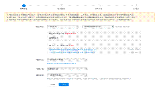 “招生单位”、“考试方式”、“报考点”在提交后无法修改,出错后只能重新报名,但存在错过报名时间的风险。所以请仔细阅读中国政法大学的网报公告,并与下方图片信息进行核对,确认报考信息无误。