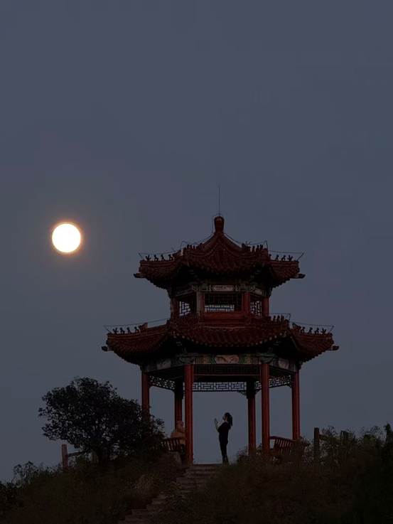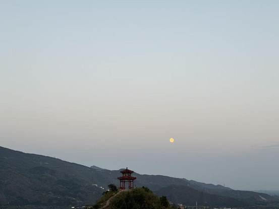 因为刚好是中秋这一天,月亮又大又圆,群山、凉亭、明月,还有群山中的我们,清风拂面,觉得整个世界都变美好了~